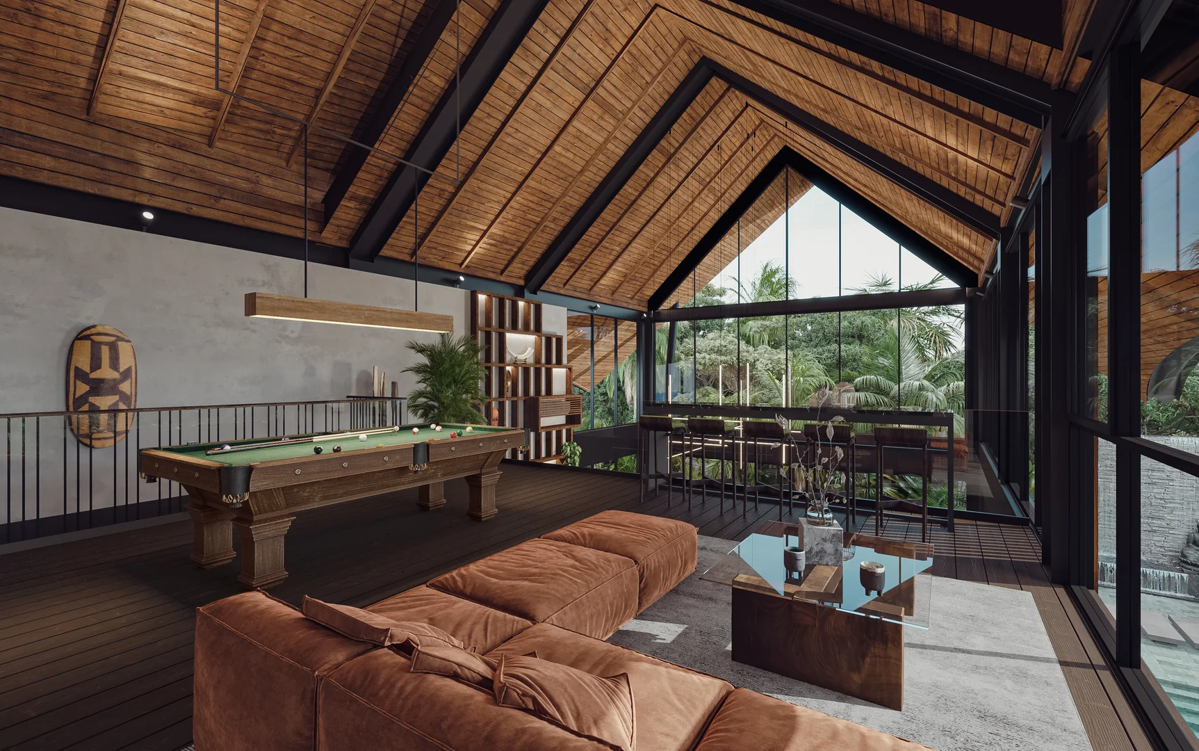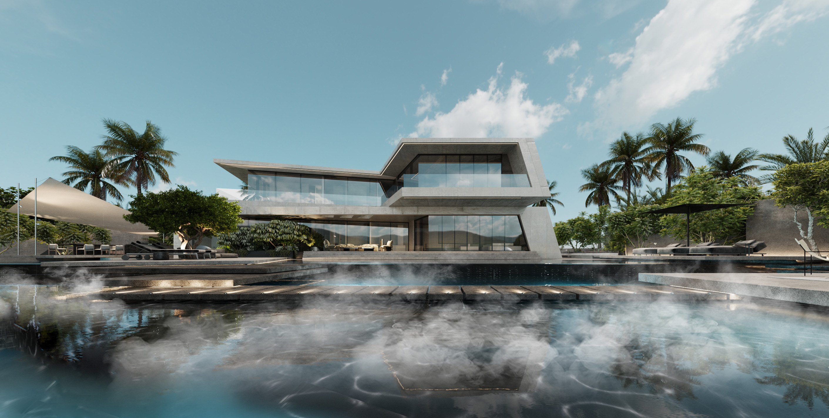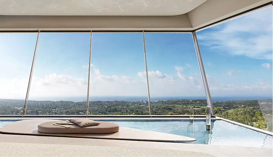 Skyfall is about freedom — the freedom of movement, the freedom of flight. Perched at the very edge of the hill, the villa exists between two forces: earth and sky. This architectural concept offers an unparalleled panoramic view of nearly all of Bali from any point in the villa — the ocean, both coastlines, volcanoes, and, at night, a sea of lights from distant homes, fishing boats, and the stars above.