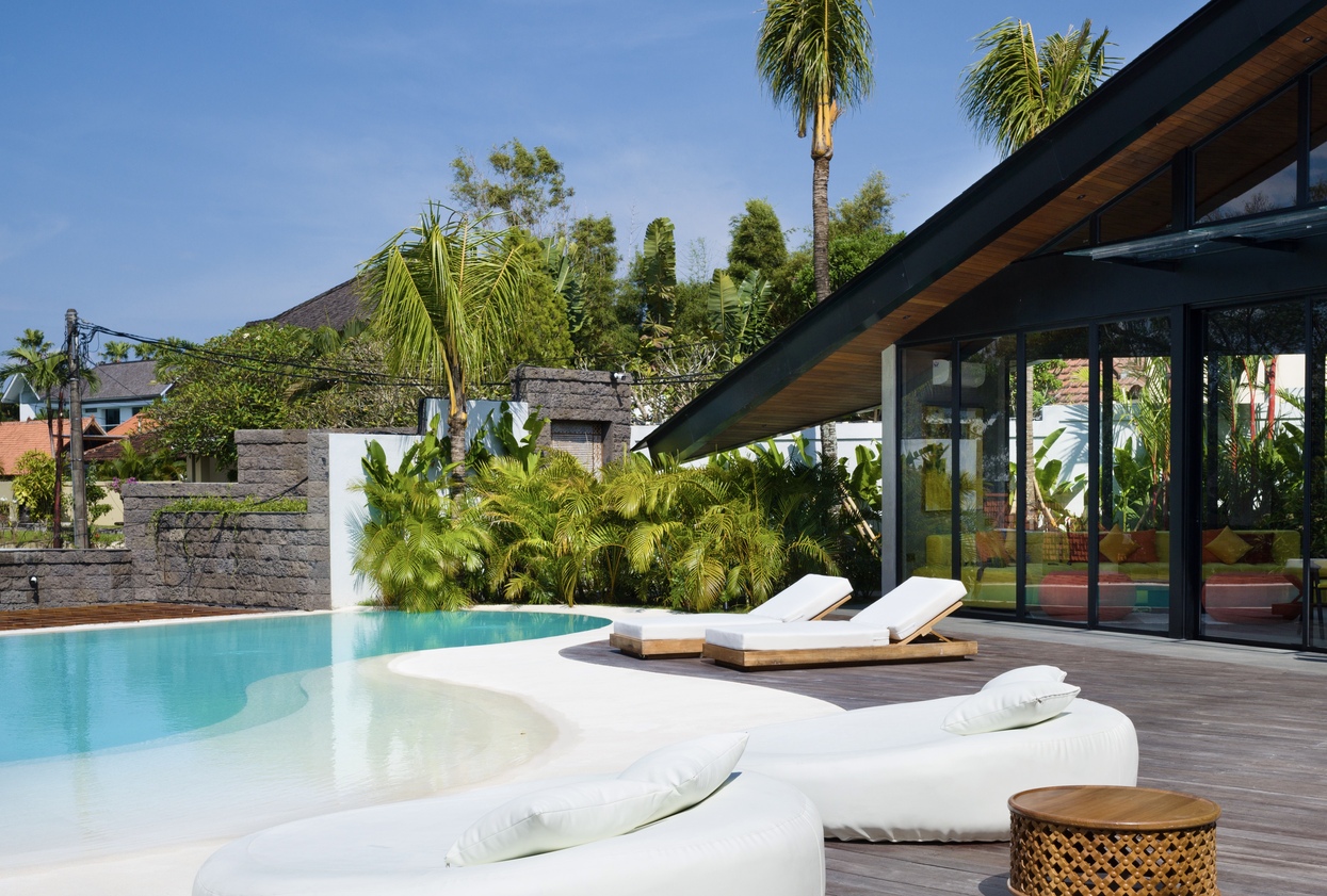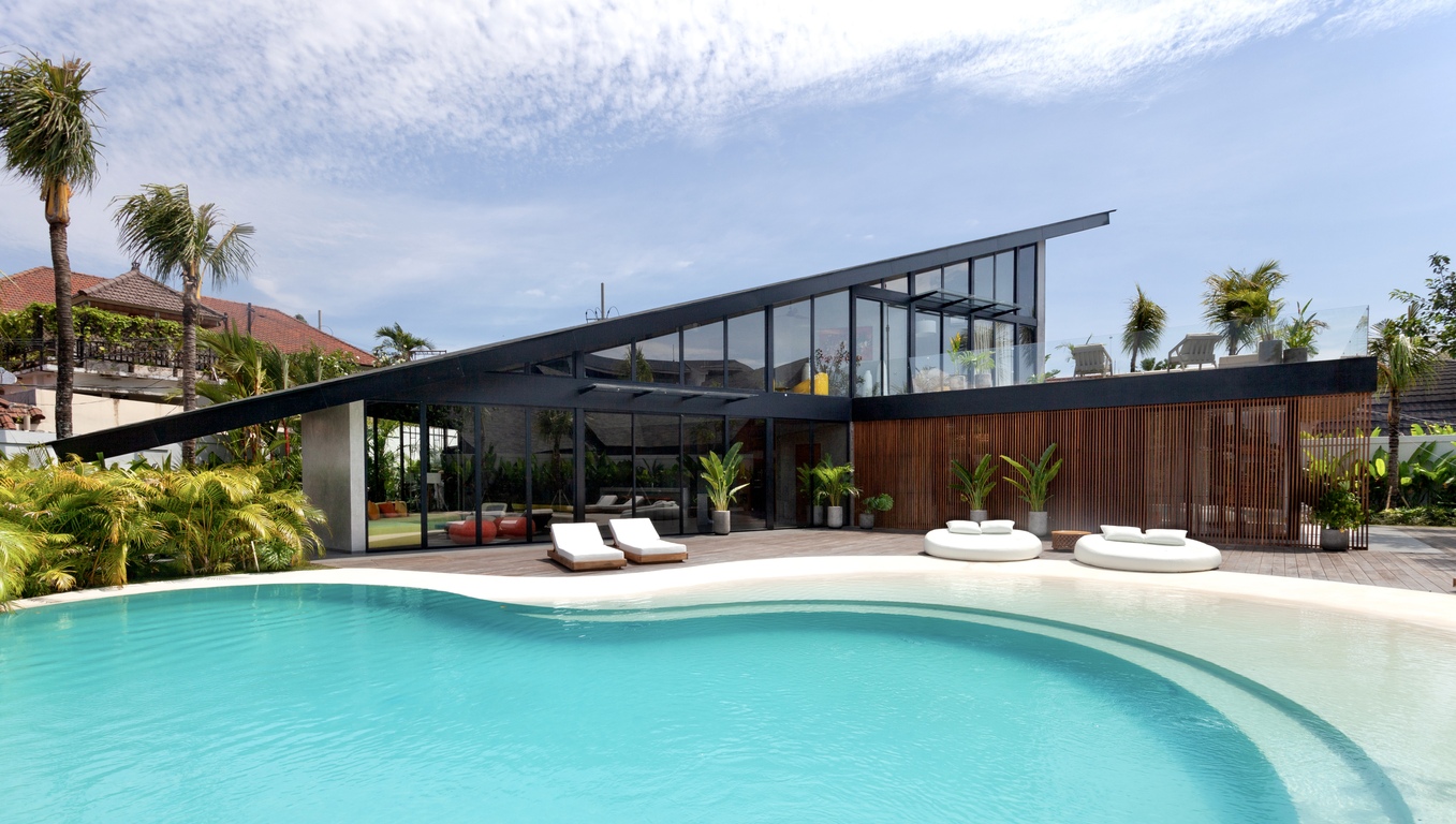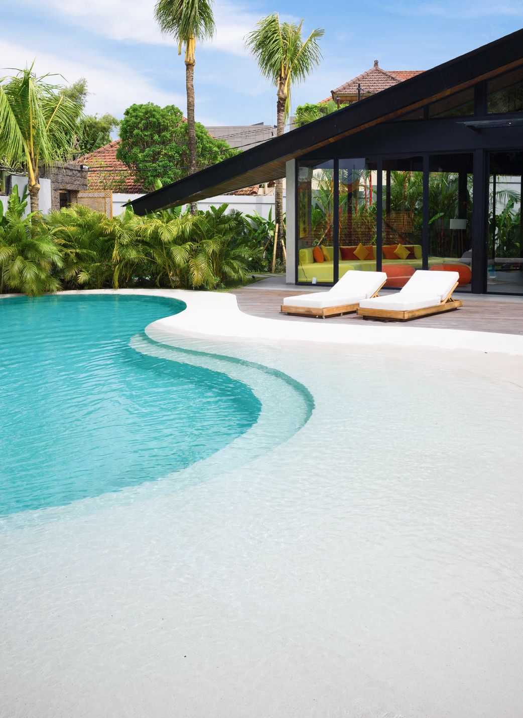 A tropical landscape with a blue lagoon, a sandy beach zone, and a luxury suite villa — a perfect getaway tucked in the serene heart of vibrant Canggu. The villa is envisioned as a seamless extension of nature. Its contemporary triangular roof, crafted from exposed steel beams, echoes the silhouette of a woodland cabin. The interior concept celebrates cultural fusion: deep, dark textures of traditional Balinese finishes are paired with the vivid energy of 1970s California-inspired furniture.