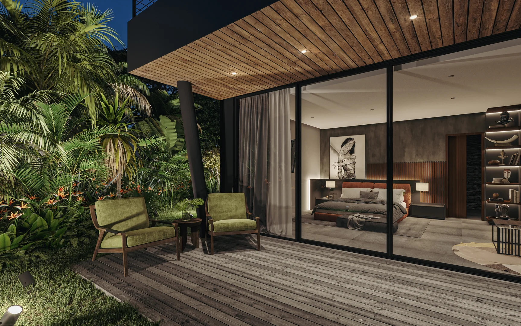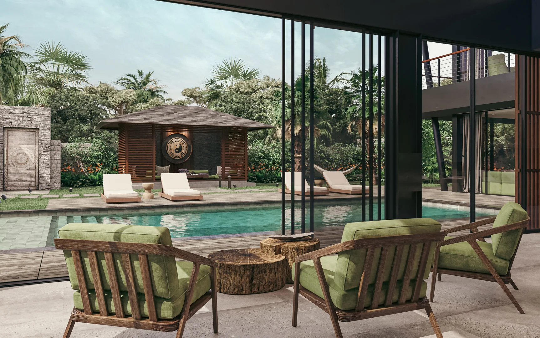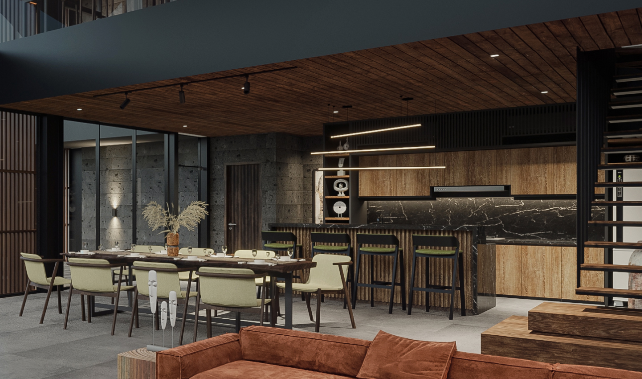 The villa's concept lies in the fusion of two contrasting cultures and styles - the Western loft and Asian classic.This vision is brought to life through the elements of the American loft aesthetic combined with Asian traditions: a Javanese wooden roof, a two-level pool in an ancient style with a waterfall, and a Japanese-inspired gazebo.The ancient Javanese roof is the key element of the architectural concept. It lends the massive building both elegance and powerful dynamism. The curved metal soffits of the roof are an impressive result of intricate craftsmanship. The walls are designed as an open steel structure with extensive glazing. The architecture combines solidity and refinement, brutality and movement, modernity and the eternal mysticism of ancient traditions.