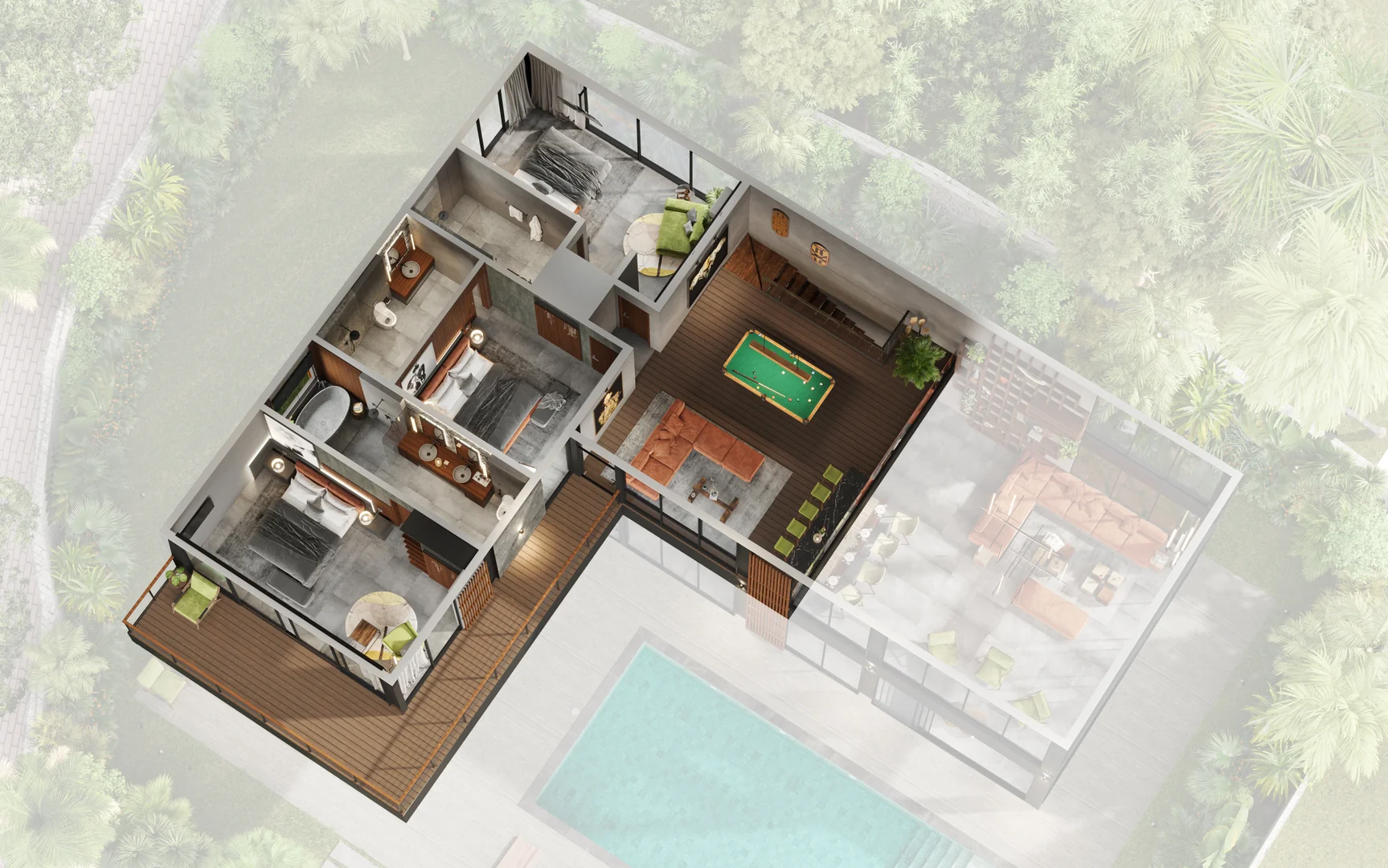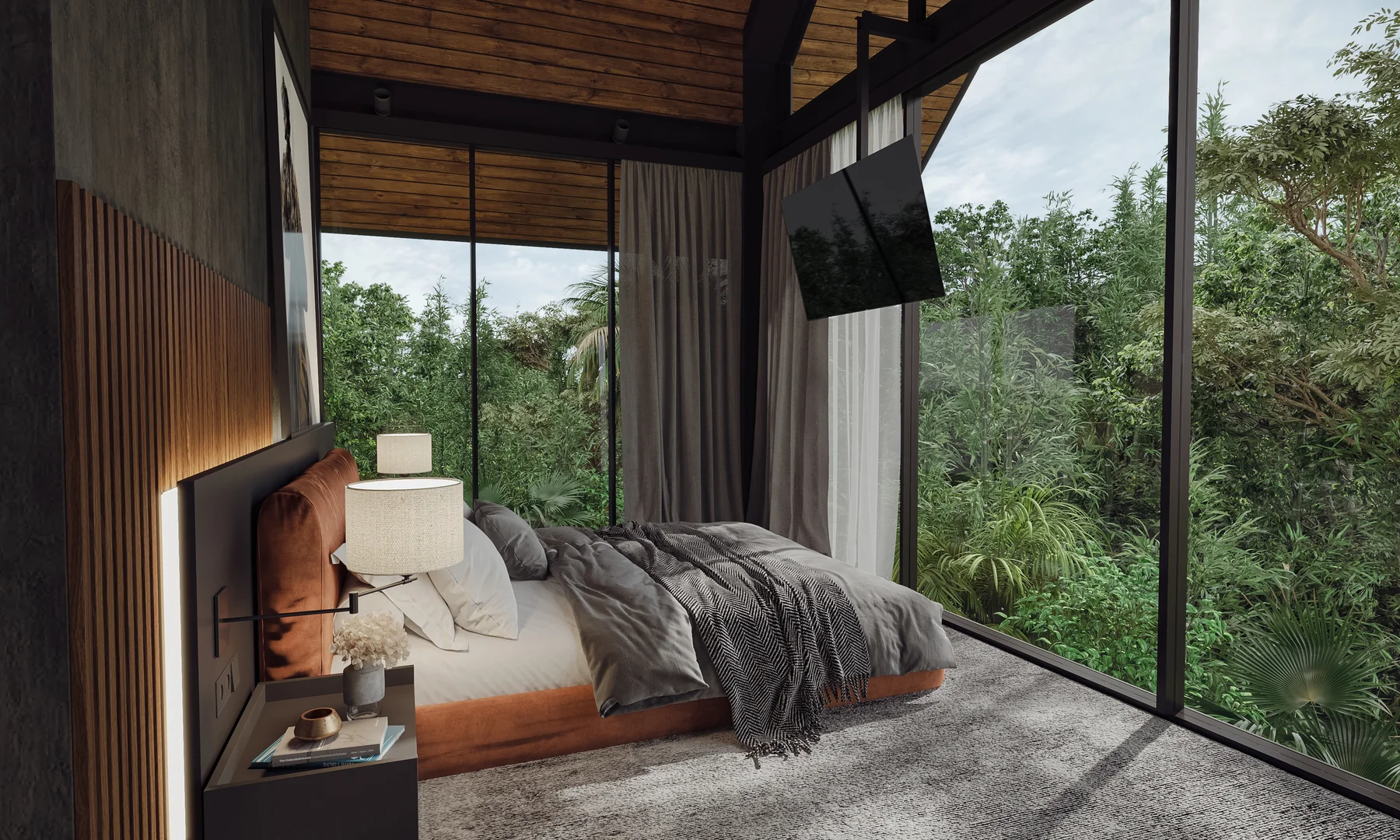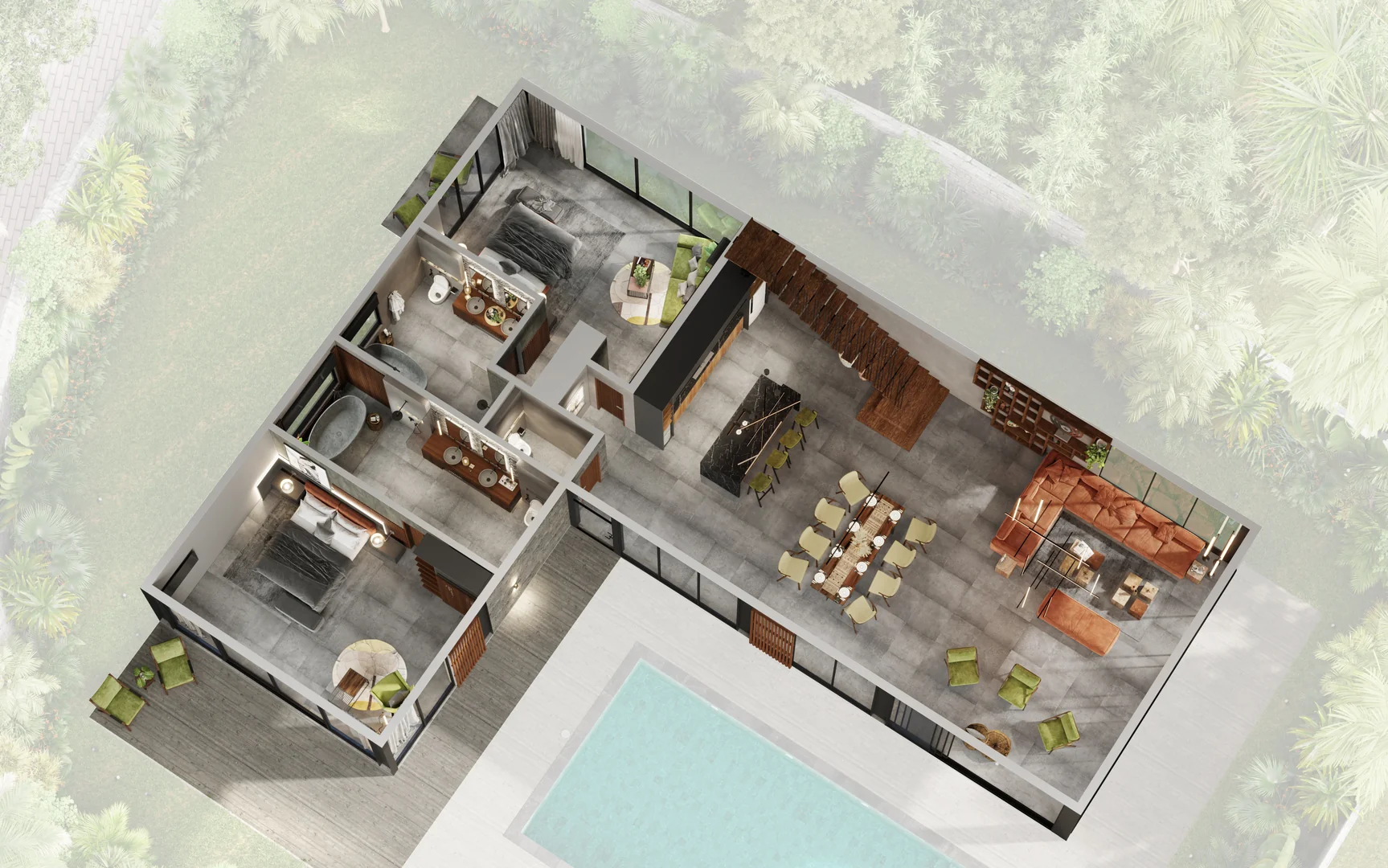The villa's concept lies in the fusion of two contrasting cultures and styles - the Western loft and Asian classic.This vision is brought to life through the elements of the American loft aesthetic combined with Asian traditions: a Javanese wooden roof, a two-level pool in an ancient style with a waterfall, and a Japanese-inspired gazebo.The ancient Javanese roof is the key element of the architectural concept. It lends the massive building both elegance and powerful dynamism. The curved metal soffits of the roof are an impressive result of intricate craftsmanship. The walls are designed as an open steel structure with extensive glazing. The architecture combines solidity and refinement, brutality and movement, modernity and the eternal mysticism of ancient traditions.