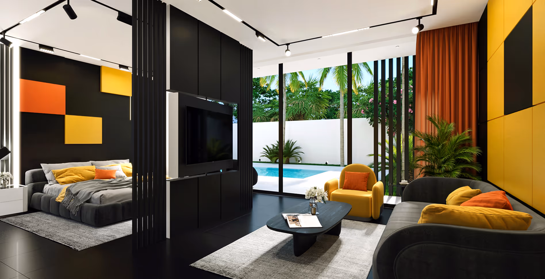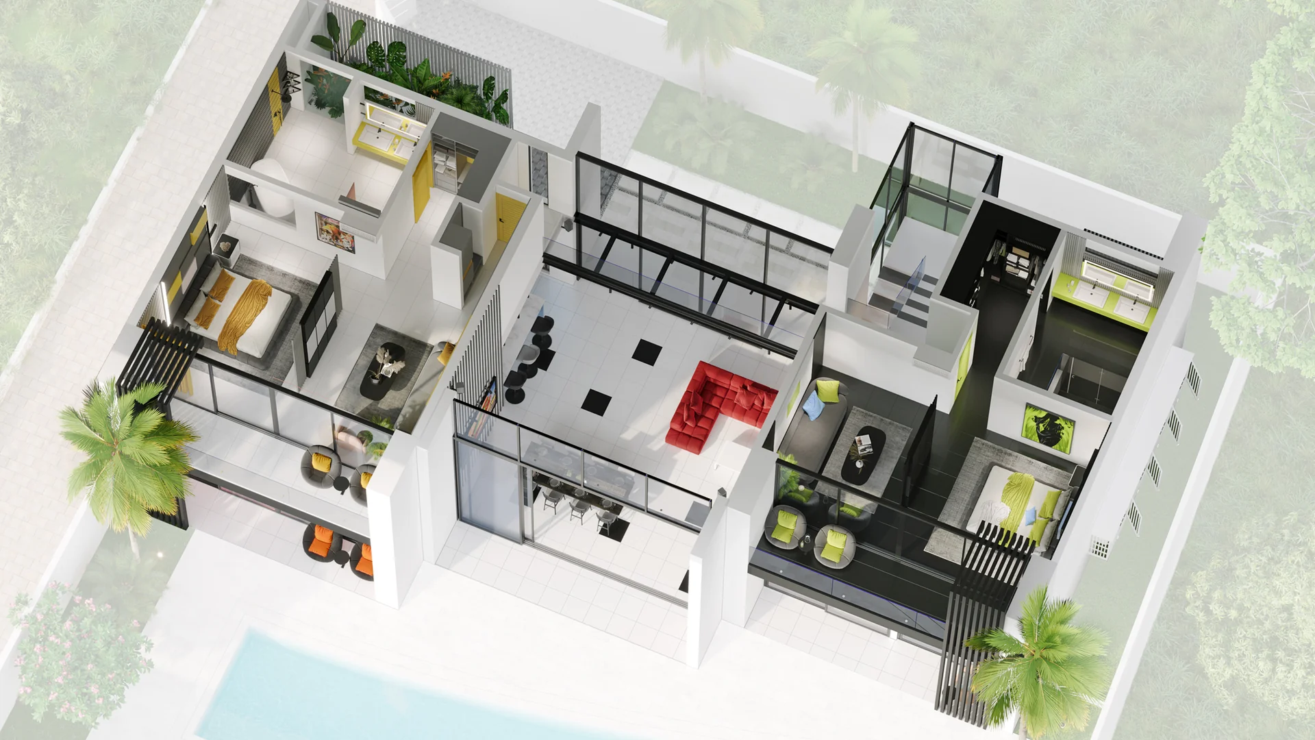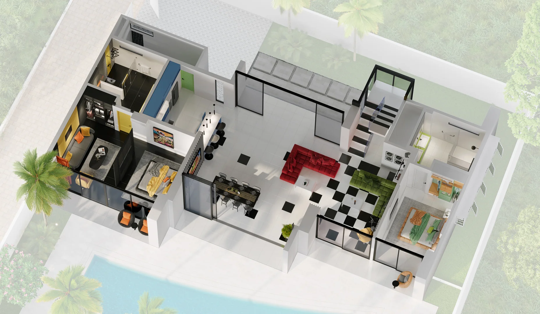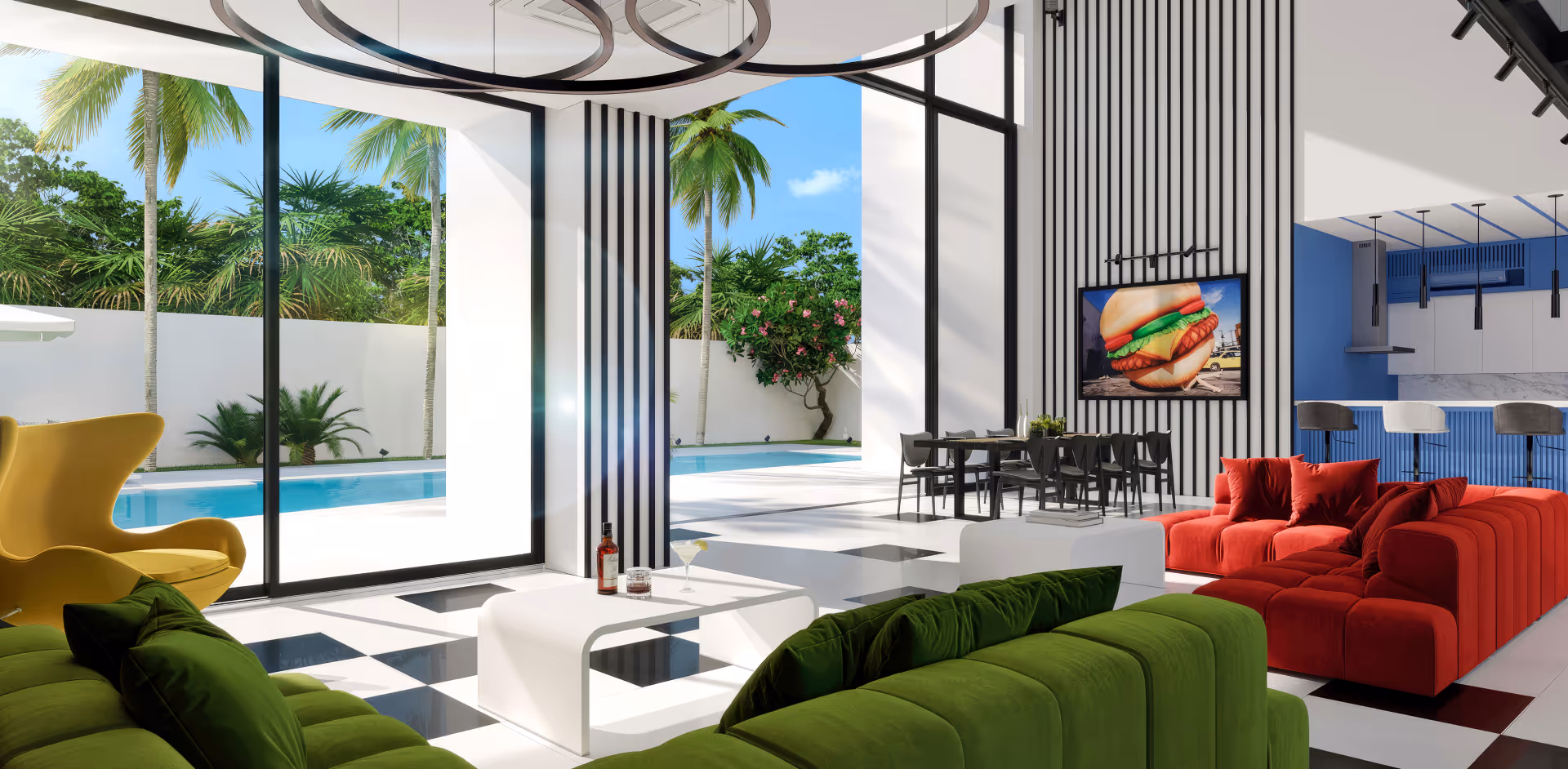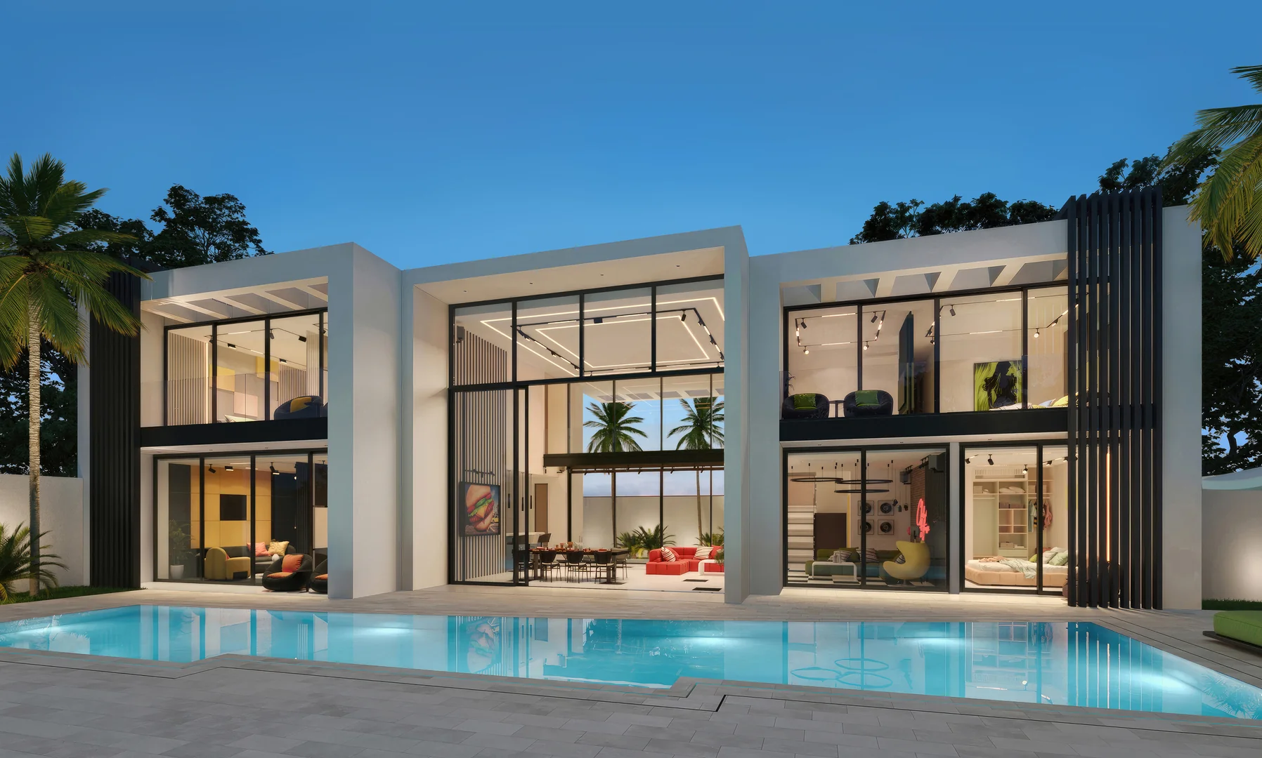 Club house, this unique villa sites as for quiet ambient evening, either for lively party — in any format, the villa's atmosphere creates a vibrant mood inspired by club aesthetics. Space, light, furniture, and interior details — everything here reflects the spirit of club culture and embodies comfort of the highest level.The core club aesthetic is created through professional lighting equipment: dynamic light can fill the interior with neon or completely recolor the pristine white exterior into any mood or atmosphere. A video projection on the interior fence can transport you to any place on Earth or simply create an unforgettable immersive environment.The club concept is further revealed through the expansive, psychedelic cube-shaped living room with a glass bridge. This space includes a kitchen with a bar and a media lounge.