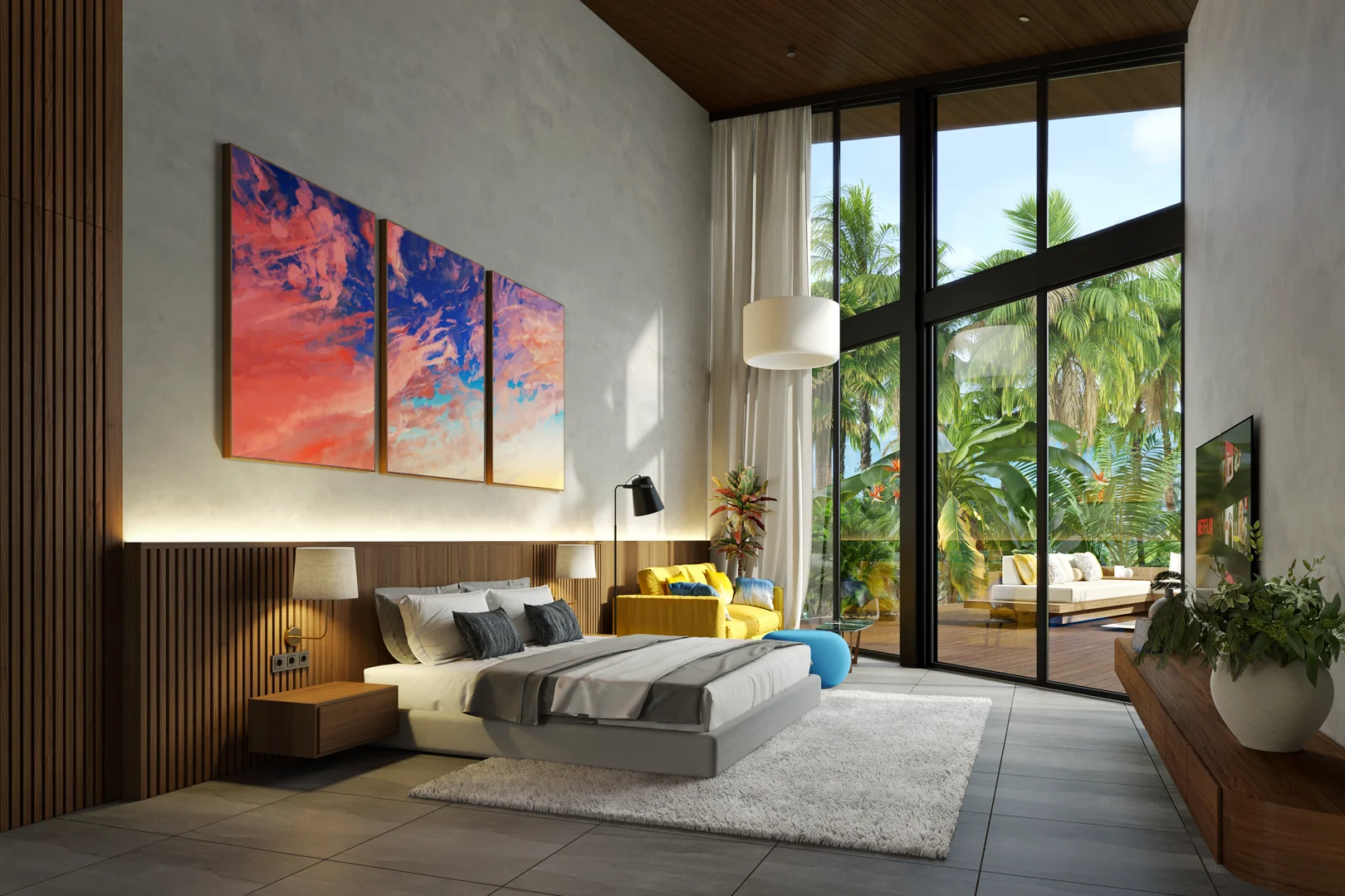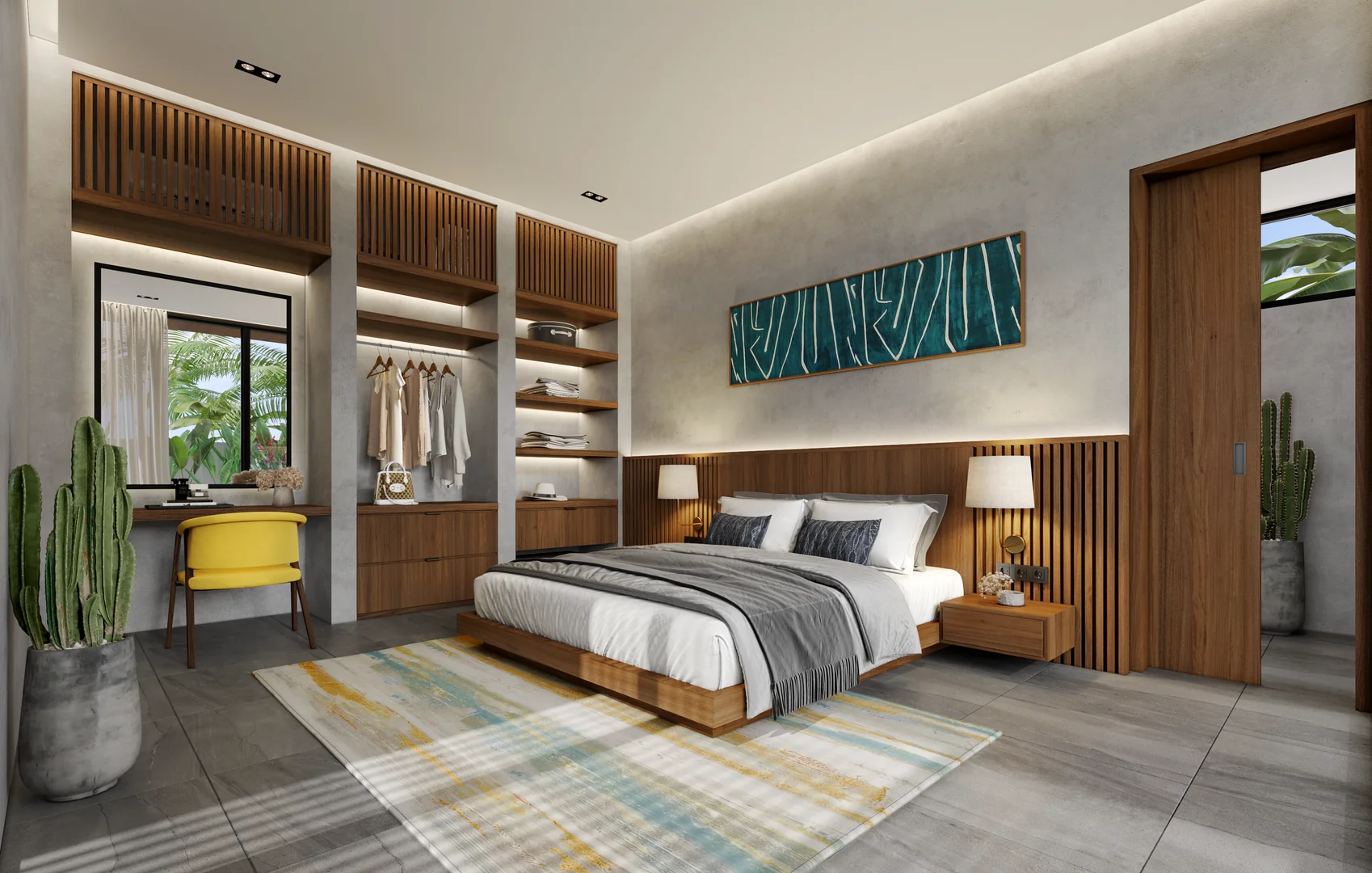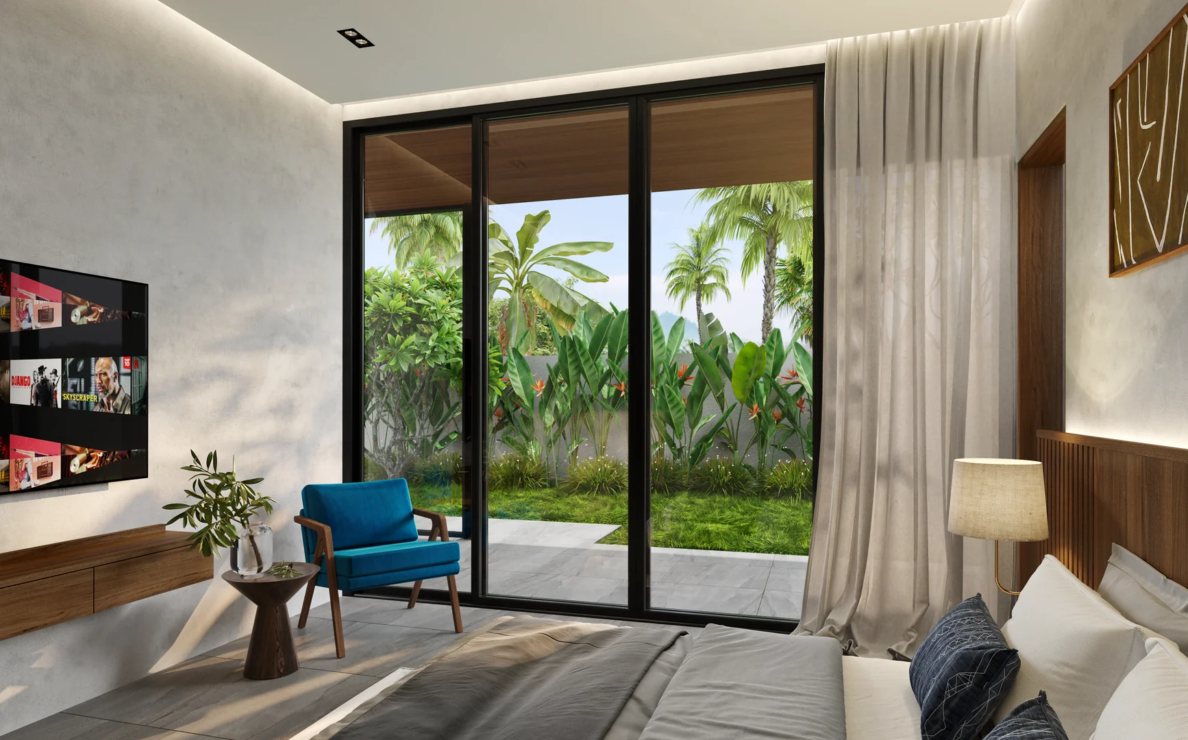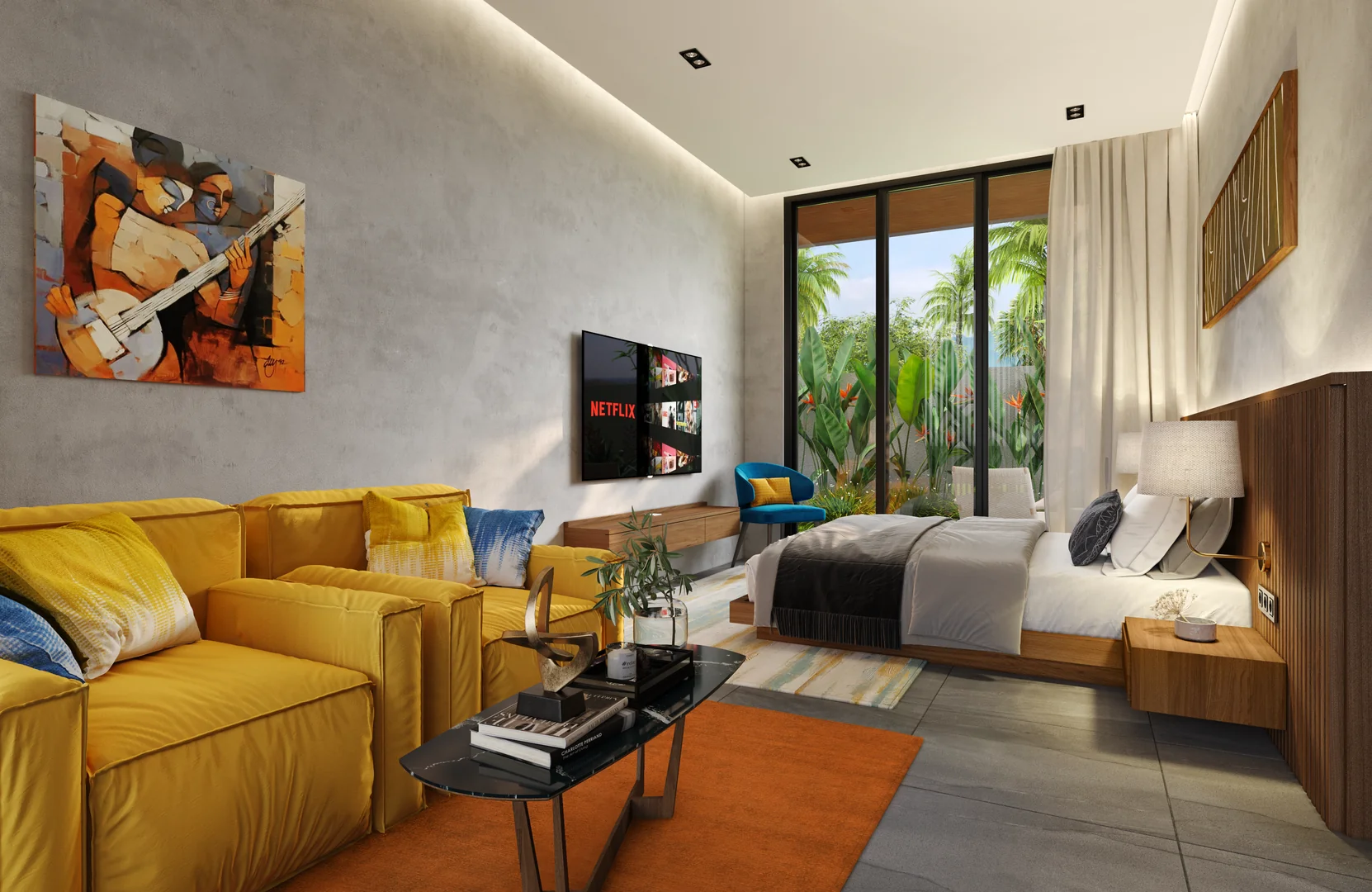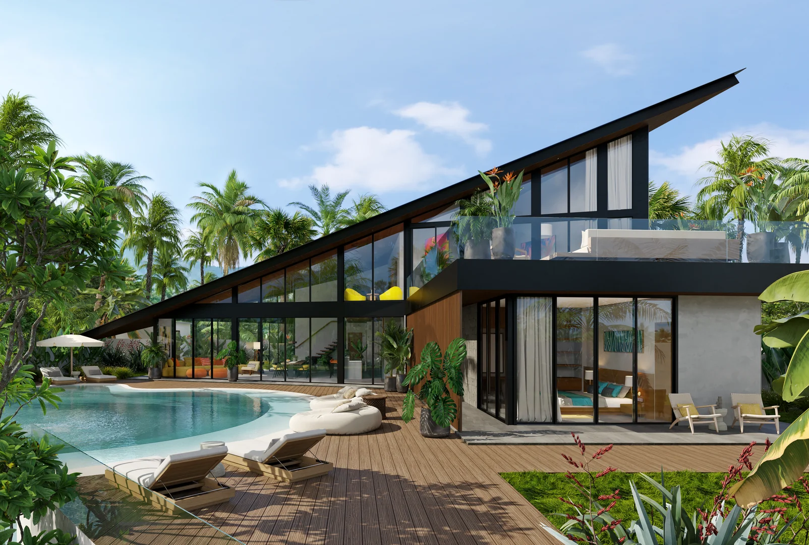 Blue lagoon is just a step away your bed.A tropical landscape with a bionic infinity pool, sandy beach zone, and luxury suite villa - a perfect getaway in the quiet heart of vibrant Canggu.The roof becomes the leading gesture of the villa's architecture - directing light and shaping the unique form and volume of the interior.The interior concept follows the idea of cultural fusion: dark textures of traditional Balinese wall finishing are paired with the vibrant energy of 70s California-style furniture.