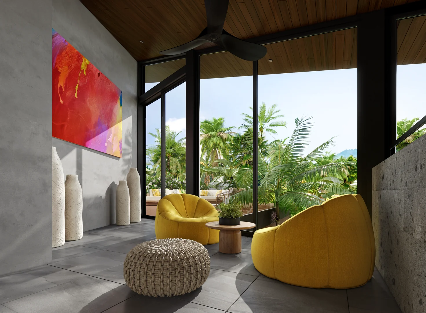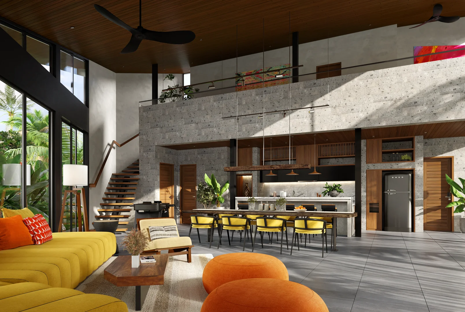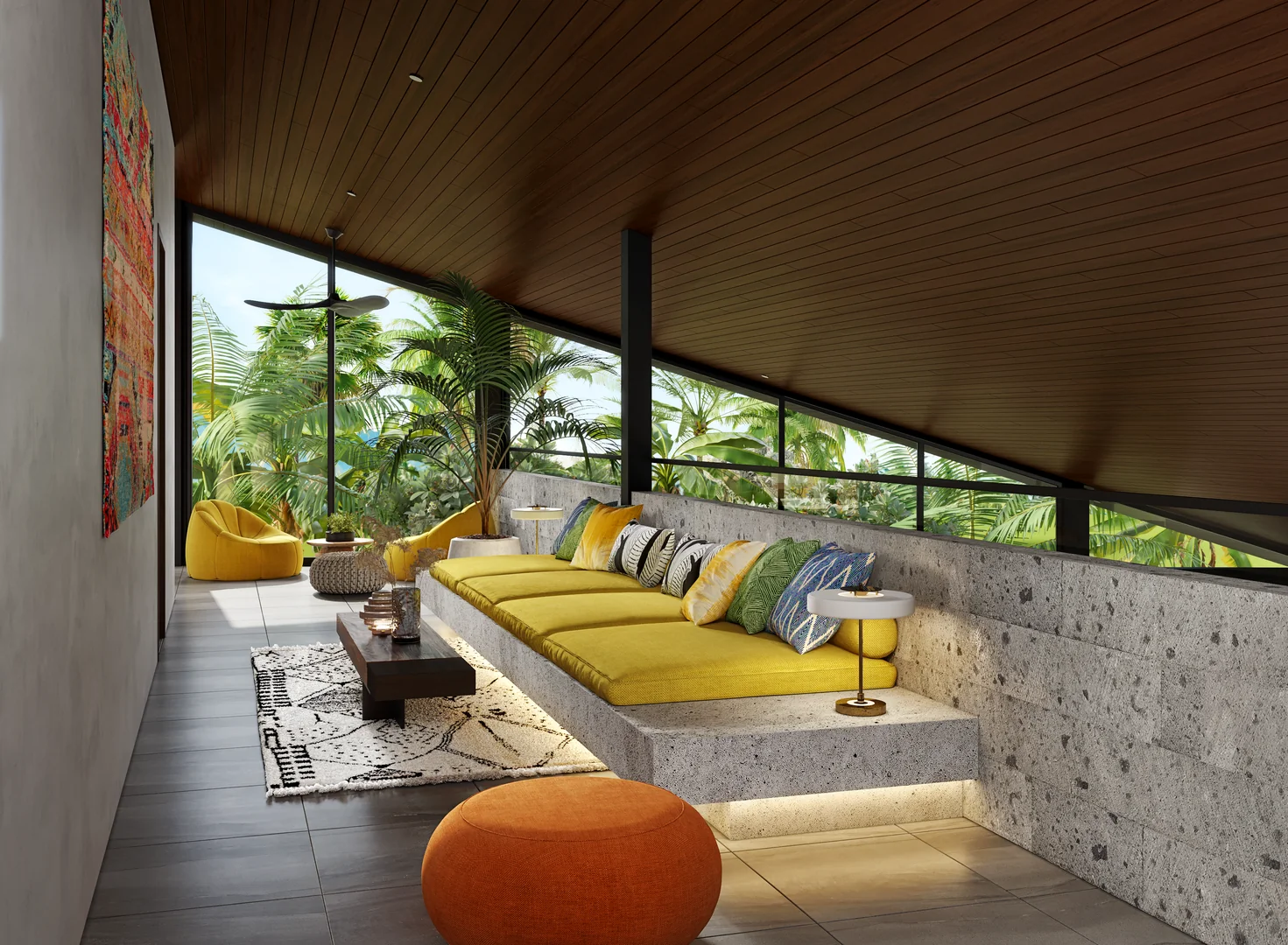 Blue lagoon is just a step away your bed.A tropical landscape with a bionic infinity pool, sandy beach zone, and luxury suite villa - a perfect getaway in the quiet heart of vibrant Canggu.The roof becomes the leading gesture of the villa's architecture - directing light and shaping the unique form and volume of the interior.The interior concept follows the idea of cultural fusion: dark textures of traditional Balinese wall finishing are paired with the vibrant energy of 70s California-style furniture.